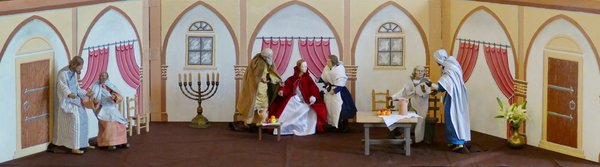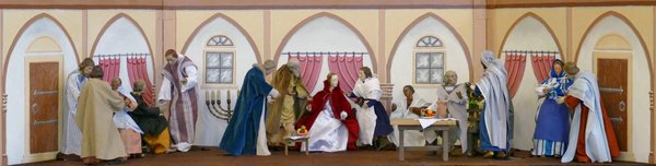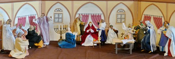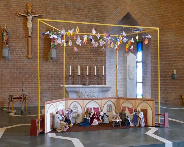 In jeweils zu den Wochenenden umgestalteten Darstellungen wird sich der Abendmahlssaal, in dem die Jünger und Maria sich versammelt hatten, verändern. Beim letzten Bild wird es dann ganz deutlich. Aus Papier gebastelte Flammen und Tauben schweben gleichsam über dem Raum als Zeichen des Heiligen Geistes. Und hierzu sind besonders alle Kinder wieder eingeladen mitzumachen.